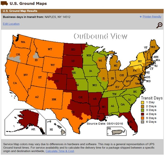 Everything ships from Naples, NY. Use this handy map for estimated delivery times:
